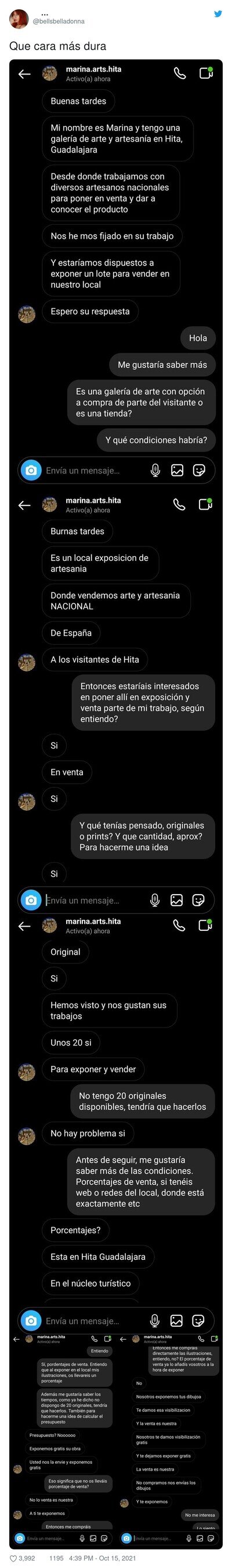 #38 #38 akatung dijo: Bordes y asquerosos que sois todos. Alguna vez he tenido que preguntar a un compañero de clase que es eso nada más, compañero, no amigo, por lo que no hablo mucho con él por el chat, me contesta, gracias, adiós, y punto final. tú lo has dicho, alguna vez, eso no me importa, pero es que hay gente que prácticamente les haces tú el trabajo. A saber cuántas veces ha tenido Claudia que responder a Mikel, y la cantidad de veces que he tenido que aguantar que gente de mi clase que ni me dirige la palabra vengan a preguntarme si se pueden copiar lo que he hecho.