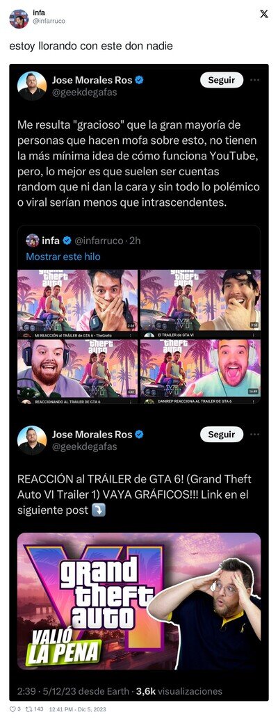 Se ríe de los influencers que reaccionan al trailer de GTA VI y el owned es inminente