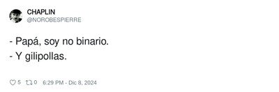 #16 #16 andrea_jm dijo: Es necesario ser tan borde? supongo que la chavala pondría lo que de que no sabia qué comentar, por lo del " empezar ", porque a priori no sabes a qué viene eso.....pero aquí parece que la gente aprovecha cualquier oportunidad para dársela de listo y dejar por los suelos a los demás. Por ver cosas como ésta se me quitan las ganas de ver los comentarios que dejan los demás seguidores de esta página, y es una pena, porque hay gente ingeniosa....pero parece que el ingenio se lleva cada vez menos, que resulta más divertido insultar.lo de que no sabia a qué venía lo de "empezar" lo he dicho yo, no la que no sabía qué comentar, con quien de hecho yo no me he metido. Aunque lo cierto es que para comentar semejante chorrada que se podría haber ahorrado que luego no se extrañe de los negativos...