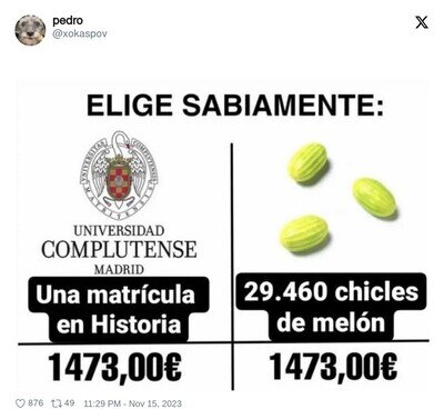#21 #21 ayanerol dijo: hay que ver lo borregos que llegáis a ser, a mi me hace mucha gracia cuando algún niñato se mete con la visita del papa solo porque le cae mal, tan tontos sois que no sois capaces de ver el beneficio ECONÓMICO que va a dejarle al pueblo, que se han gastado millones en que venga? si, pero son muchos mas los millones que se recaudan después de que se vaya.... ays pero como tenéis que ir en plan modernos y de indignados, pues os voy a decir una cosa, si tanta democracia queréis empezad por respetar a toda esa gente que se ha reunido estos días en Madrid, porque yo no soy homosexual y sin embargo con mis impuestos se pagan cinco días de fiesta del orgullo, y me callo y punto. hipócritas, decís que queréis democracia y la vetáis vosotros mismos con falsedad.... creeme que no vas a ver ni un centimo del todo supuesto que va dejar de dinero y digo supuesto ..xq no se si ves q se les esta regalando que si transporte publico, comida ...etc.. etc..