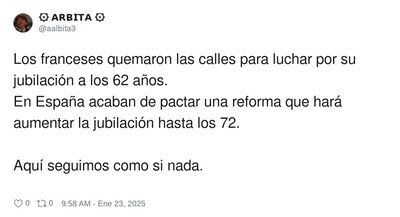#15 #15 grammarnazi dijo: #13 Pues sí, solo he contestao para crear polémica, porque no sirve de nada hacer un comentario gracioso o inteligente con este tema, porque ya cansa...se podía hacer un último comentario gracioso, y lo ha hecho #5 #5 un_tal_fran dijo: Pronto prohibirán las autopistas, las descargas serán para mayores de 67, y la jubilación no se podrá hacer en lugares públicos, el tabaco a 110 euros... creo que me he liado un poquitoxDD pffff de verdad que no sé quien lleva el tema de las publicaciones, sigo pensando que es un mono ciego, no entiendo como pueden tener tan poca gracia y ser tan repetitivas.