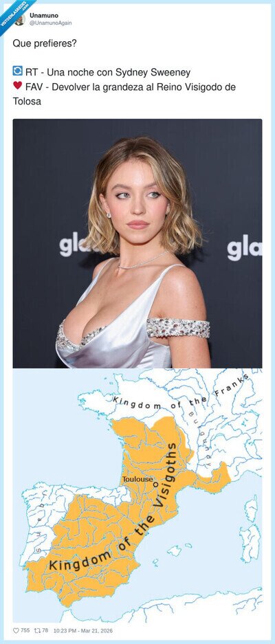 Yo: “una noche con Sydney Sweeney”. También yo, a las 3am: “pero el Reino Visigodo de Tolosa merece una segunda oportunidad”, por @UnamunoAgain