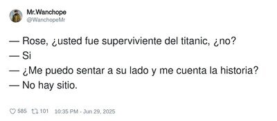 Oh, la canción de Titanic ... un momento voy a por pañuelos que esa canción me hace llorar T.T