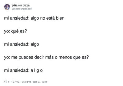 Leer una de esas dos frases después de alguna ocurrencia graciosa, le quita totalmente la gracia.Huir girando sobre tu propio eje y siguiendo la parábola descrita por f(x) = x^2 - 4x en el sistema de referencia del médico. Todo esto llorando mientras gritas que nunca te convertirás en una bonita jirafa y te atas los cordones de los zapatos.