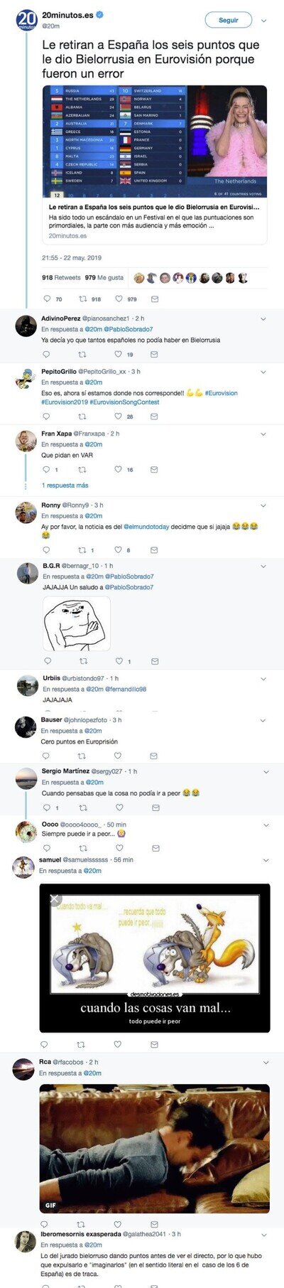 Le quitan a España seis puntos de Eurovisión porque Bielorrusia se equivocó