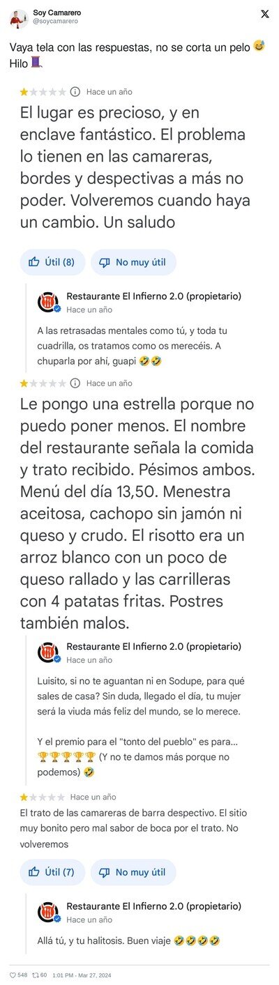 El restaurante cuyo propietario se cree que está en el Club de la Comedia rajando así de las reseñas