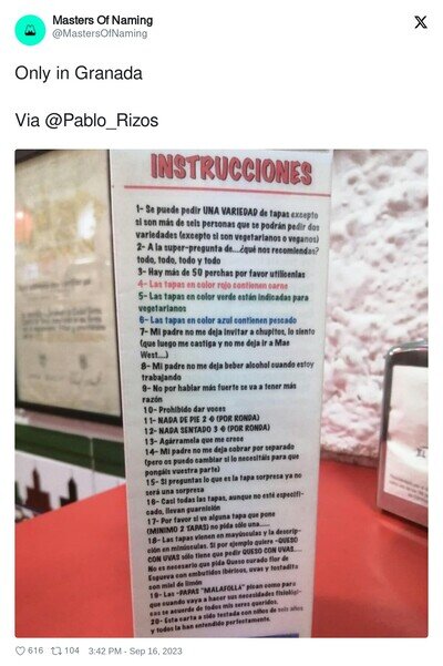 Instrucciones top en un bar de tapas en Granada