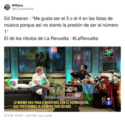 #2 #2 tonchumg dijo: El programa es malísimo, sin ideas. Y pensar que todo es con nuestros impuestos. Es para ir a la sala esa de teatro y liar un bataclan#3 #3 _adv_ dijo: Lo único seguro es que verás basura woke gratuita, colaboradores que dan vergüenza ajena y a un presentador incapaz de hacer una entrevista interesante, solo pregunta gilipolleces o les hace hacer tonterias, una pena porque ha habido algunos, pocos, invitados interesantes.