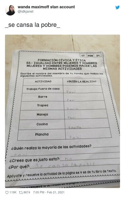 Esta hoja de ejercicios de una niña es un partimiento, pobre Fani, por @idkjanet