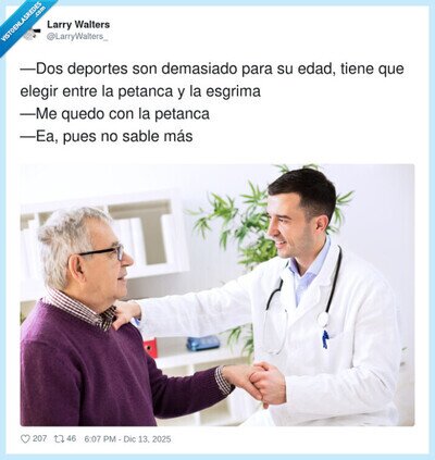 El médico: "dos deportes son demasiado". Mi abuelo: "pues mira, también dos pastillas son demasiadas", por @LarryWalters_