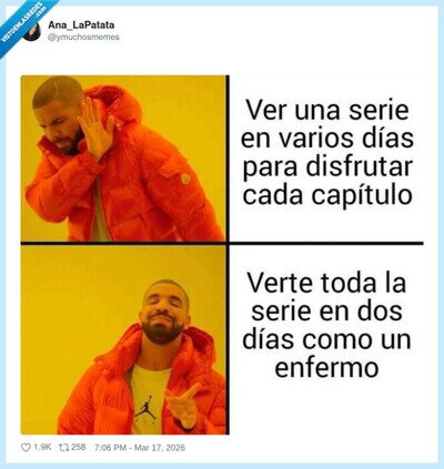 Yo: “un capítulo y a dormir” / Yo a las 4:37: “bueno, ya casi acabo la temporada”, por @ymuchosmemes